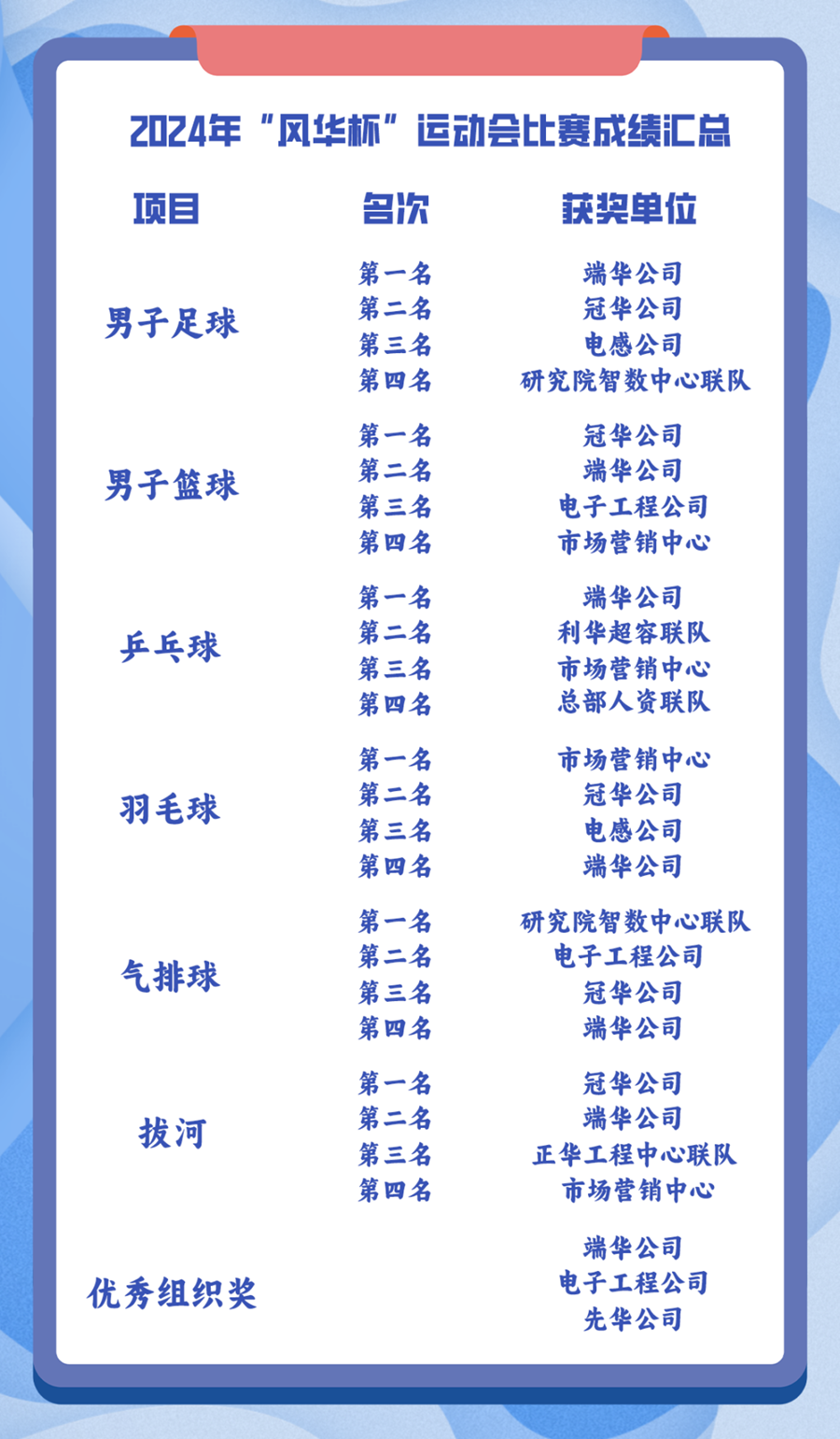 一年一度的“風華杯”運動會是風華高科企業文化建設的特色品牌,也是風華人勇立潮頭、爭創佳績的舞臺。本屆運動會歷時兩個月,整個賽事環環相扣,精彩紛呈,共有12個單位、63支運動項目代表隊、籃球、足球、羽毛球、乒乓球、氣排球、拔河六大項目。各比賽項目呈現百花齊放的局面,冠華公司鉚足一股勁、擰成一股繩,榮獲籃球、拔河冠軍;端華公司一路高歌、橫掃群雄,勇奪足球、乒乓球冠軍;市場營銷中心在強勢項目上保持實力,蟬聯羽毛球冠軍;研究院智數中心聯隊依舊在氣排球項目獨霸江湖,蟬聯冠軍;電子工程賽出歷史最好成績,利華、正華頑強拼搏不服輸的精神令人動容.......
