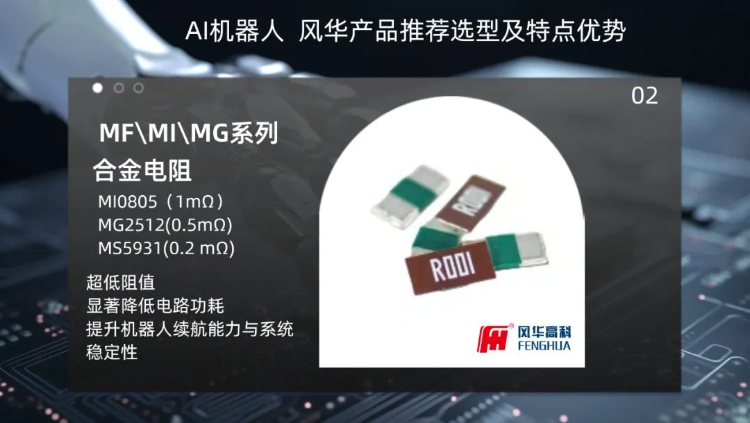 在電流檢測方面,合金電阻MFMIMG系列,如MI0805(1mΩ)、MG2512(0.5mΩ)、MS5931(0.2 mΩ)等,憑借其超低的阻值,顯著降低了電路的功耗,優化電源轉換效率,進一步提升機器人的續航能力與系統穩定性。