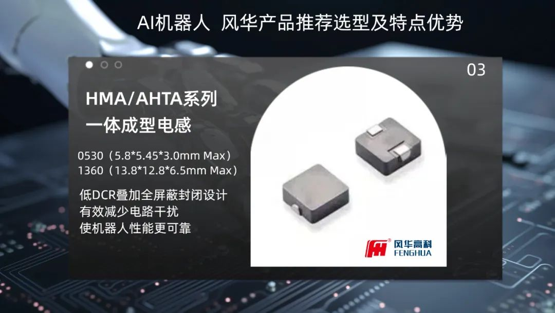 一體成型HMA/AHTA系列合金電感以其極低的DCR(直流電阻)和超大的過電流能力脫穎而出。全屏蔽的封裝設計有效減小了對周圍電路的干擾,使機器人的性能更加穩定可靠。同時,射頻高Q電感的應用,確保了AI機器人的通信靈敏度,使數據交互更加準確無誤。
