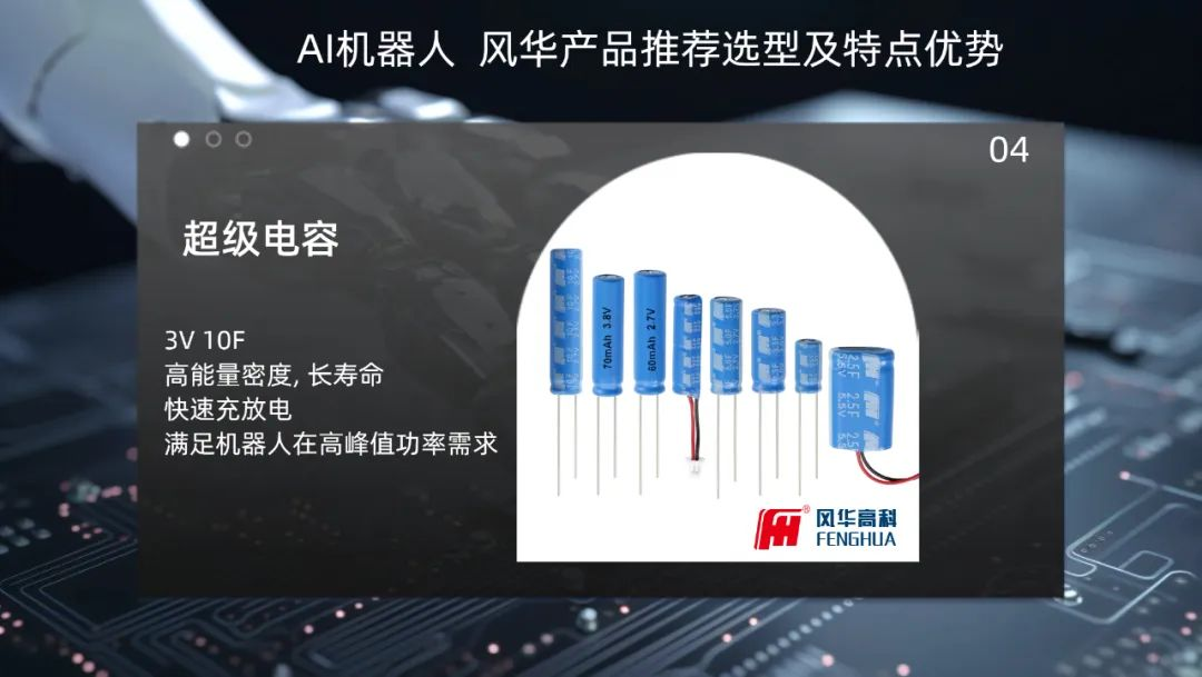 為了進一步提升AI機器人的電源性能,特別推薦具有高能量密度、快速充放電以及長壽命等優點的超級電容器,能夠在短時間內提供大量電能,滿足機器人在高峰值功率需求時的穩定供電。結合上述高性能元器件,超級電容器將為AI機器人提供更加持久、穩定的電源支持,助力其在復雜環境中高效運行。