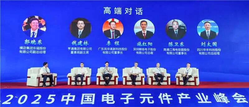 峰會以“創新驅動,共筑產業新生態”為主題。峰會特設了高端對話環節,亨通集團董事局錢建林副主席、廣東風華高新科技股份有限公司李程董事長、深圳順絡電子股份有限公司施紅陽總裁、南通江海電容器股份有限公司陳衛東董事長、四川華豐科技股份有限公司劉太國總經理等五位企業家就電子元器件行業重點應用市場的發展、如何遏制行業內卷、中美貿易戰對電子元器件行業的影響等內容,開展了熱烈討論。李程指出,國產替代帶來的存量市場、智能時代帶來的增量市場、新應用場景帶來的產品更高性能需求,為關鍵基礎元器件尤其是MLCC帶來巨大發展空間;市場競爭本是行業發展的動力,但需警惕過度內卷帶來的資源浪費與創新乏力問題,企業應主動把握國產替代機遇,大力弘揚企業家精神,筑牢戰略定力,堅決摒棄盲目與破壞產業生態的惡性競爭,聚焦高端化創新與轉型方向,加強產業鏈上下游技術的整合與協同。同時,在政府及行業協會的牽頭組織下,積極制定高端產品的強制性標準,通過技術標準、專利有效的法治保護避免內卷,為行業整體高質量發展提供優秀的生態環境支撐。