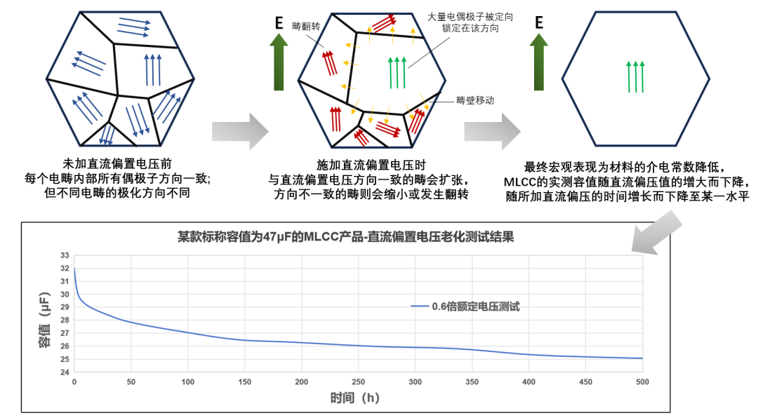 圖1電容老化機理示意圖(每個六邊形代表介質(zhì)層中的一個晶粒)及測試案例
