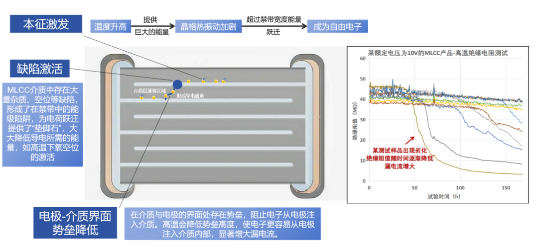 二是國內(nèi)在MLCC長周期高溫絕緣電阻測試方面始終缺乏明確規(guī)范。高溫不僅通過“本征激發(fā)”使電子躍遷到導(dǎo)帶形成電子漏電流,更主要的是激活了材料缺陷(如氧空位),一方面使其能輔助電子導(dǎo)電,另一方面帶正電的氧空位自身也能遷移形成離子漏電流,同時高溫還會降低電極與介質(zhì)間的勢壘,導(dǎo)致電子注入,多種機制共同作用致使MLCC產(chǎn)品的絕緣性能在高溫工作環(huán)境下可能會出現(xiàn)逐漸下降的趨勢。