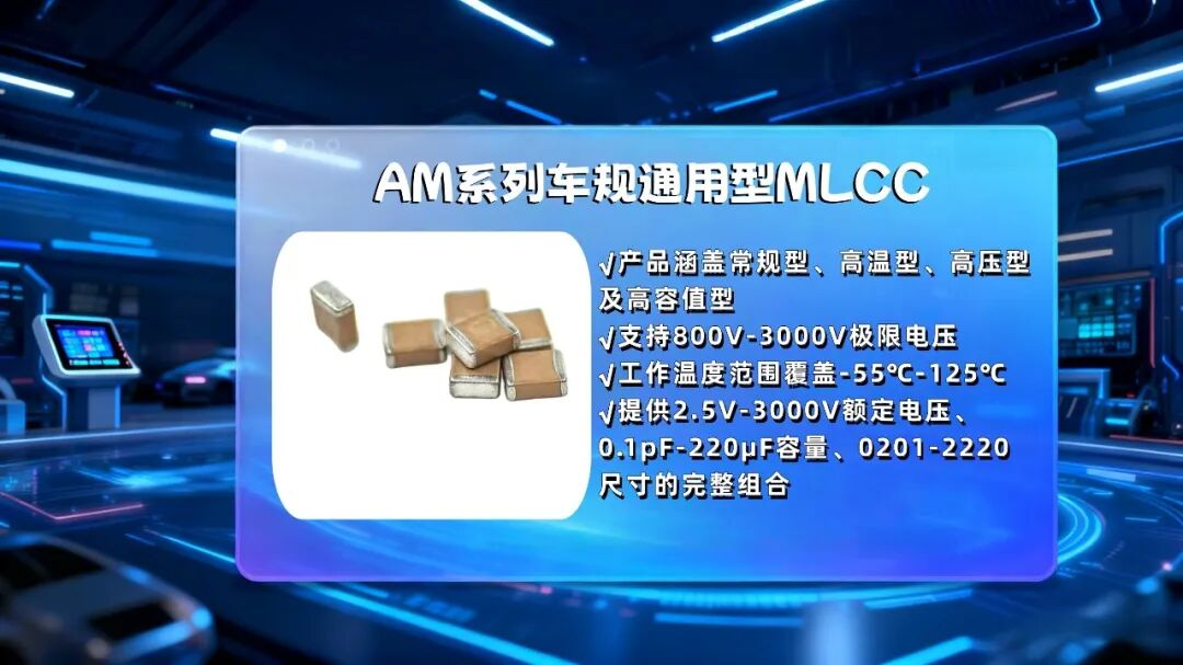 AM系列車規通用型MLCC:產品涵蓋常規型、高溫型、高壓型及高容值型,工作溫度范圍覆蓋-55℃至125℃,支持800V-3000V極限電壓,適應從寒冷地區到引擎艙高溫的多樣環境,滿足不同車載場景的差異化需求。