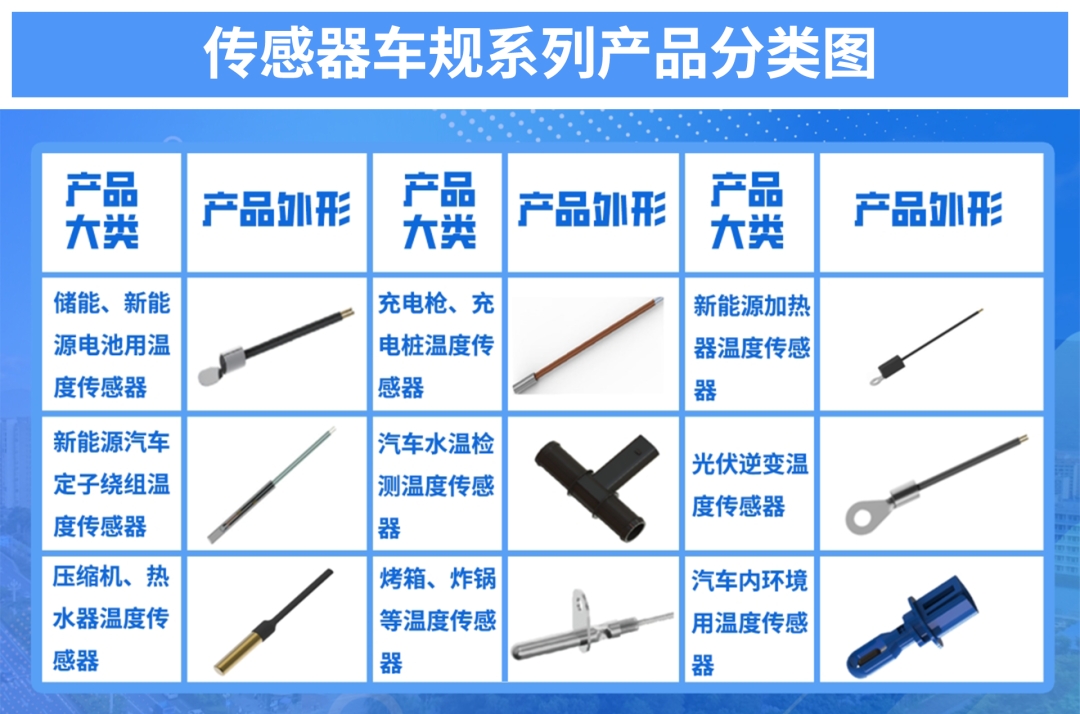 車規級溫度傳感器:覆蓋常規、高精度型號,具有高穩定性,應用范圍貫穿新能源與傳統燃油汽車核心系統,可監測動力電池、電機控制、車載充電系統,以及發動機冷卻液、變速箱油、空調系統等關鍵部位。