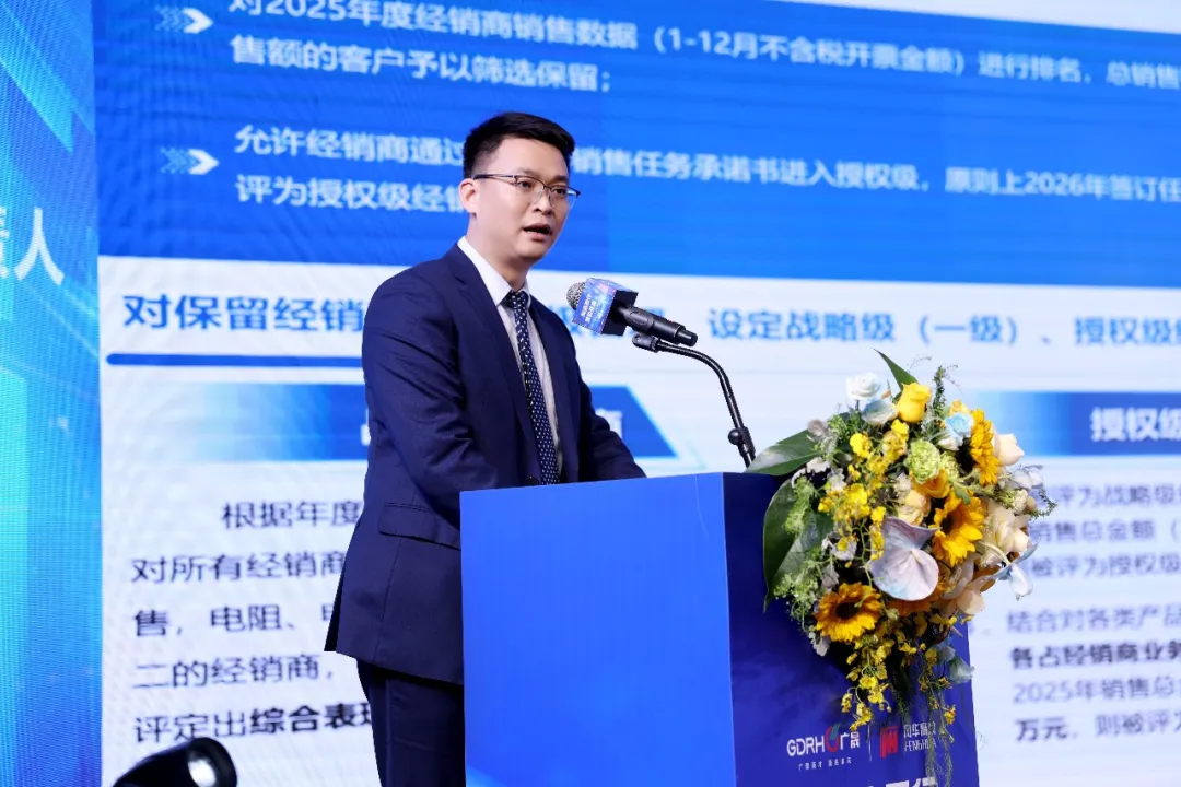 2025年度優(yōu)秀經(jīng)銷商代表發(fā)言。他們分享了與風(fēng)華高科合作的市場開拓經(jīng)驗(yàn)及客戶服務(wù)心得,明確2026年將緊跟風(fēng)華高科發(fā)展戰(zhàn)略,深耕區(qū)域市場,在技術(shù)適配、渠道拓展上精準(zhǔn)發(fā)力,以優(yōu)質(zhì)服務(wù)撬動(dòng)市場增量,攜手開創(chuàng)互利共贏新局面。