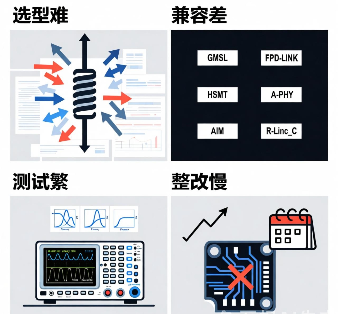 ?兼容差:GMSL、FPD-Link、HSMT等主流芯片協(xié)議層出不窮,各協(xié)議對S參數(shù)頻率響應(yīng)要求各異,方案難以通用,設(shè)計(jì)周期長。