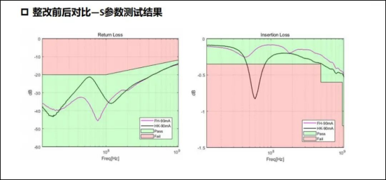 ?板級實(shí)測:S參數(shù)測試發(fā)現(xiàn)施加直流電流后40MHz-90MHz、500MHz頻段插入損耗超標(biāo);