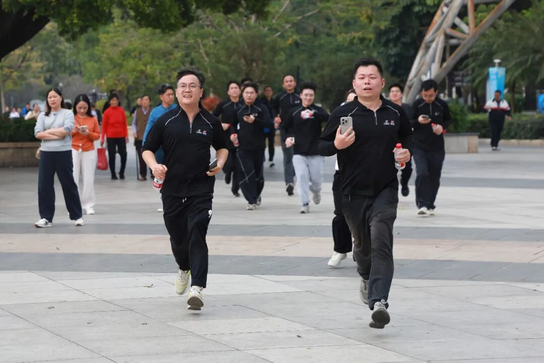 樂跑途中,浩浩蕩蕩的隊伍穿梭在牌坊公園綠道,整齊的步伐、昂揚的姿態,與周邊的綠樹繁花、湖光山色相映成趣,成為七星巖湖畔一道躍動的風景線。500多名樂跑隊員并肩奔跑、彼此鼓勁,有的奮力奔跑、全力沖刺,以最快速度向著終點進發;有的穩步前行、攜手共進,在奔跑中感受團隊協作的動力。約4公里的賽道上,風華人以“永爭第一”鐵軍精神向目標奮進,把奔跑的韌勁化作干事的拼勁,把同行的默契凝為攻堅的合力,把逐夢的熱忱鑄成發展的動能,推動公司不斷攀高躍升。